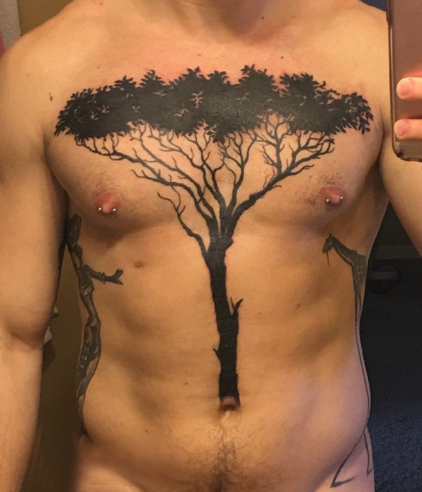 纹身胸部男 男生胸部黑色的大树纹身图片