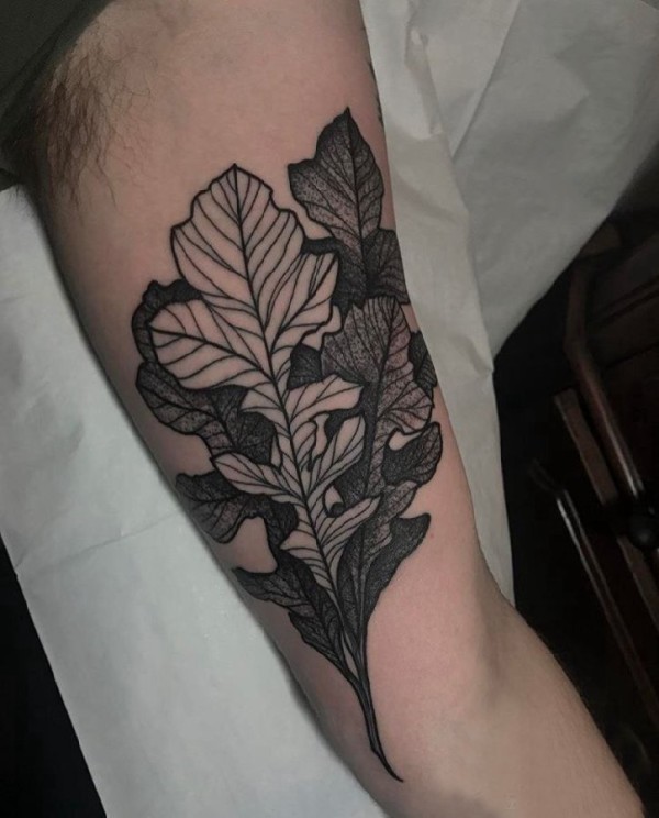 手臂纹身素材 男生手臂上黑色的叶子纹身图片