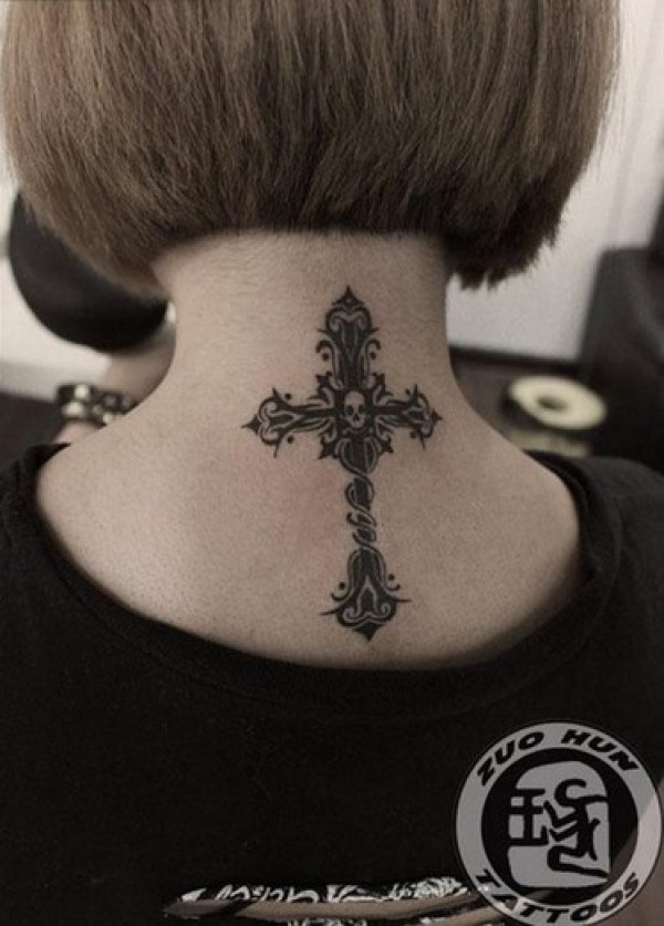信仰十字架颈部纹身