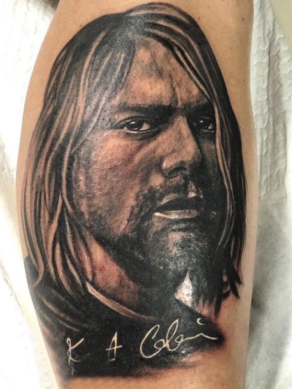 人物肖像纹身 男生小腿上人物肖像纹身黑灰纹身图片