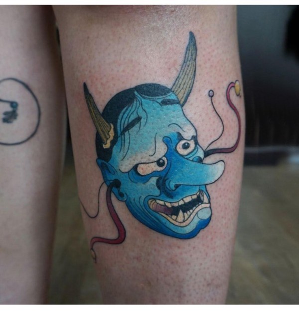 般若面具纹身 男生小腿上彩绘的般若面具纹身图片