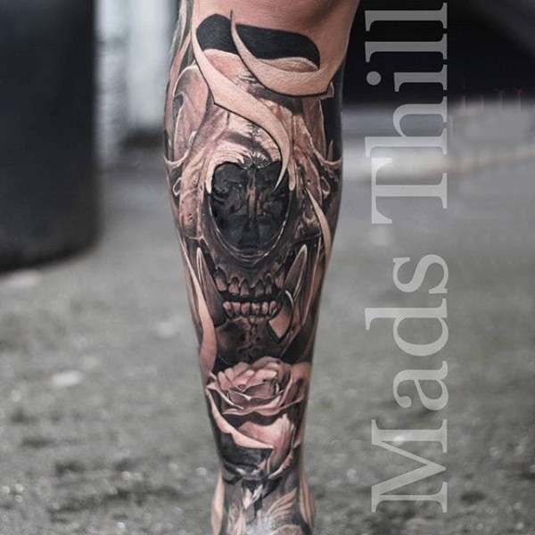 男人大臂黑白彼岸花骷髅_黑白纹身图案大全_纹身图吧