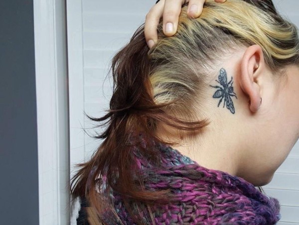 小蜜蜂纹身 女生耳后黑色的蜜蜂纹身图片