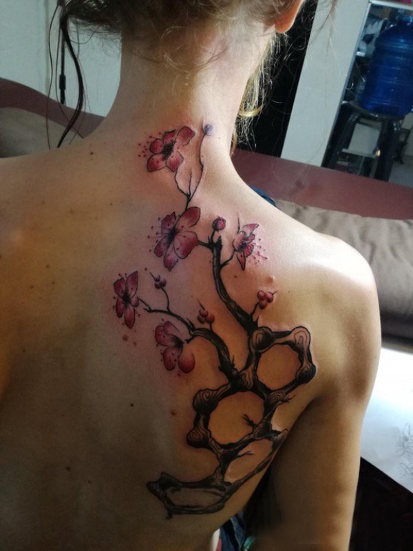 纹身后背女 女生后背上彩色的樱花纹身图片