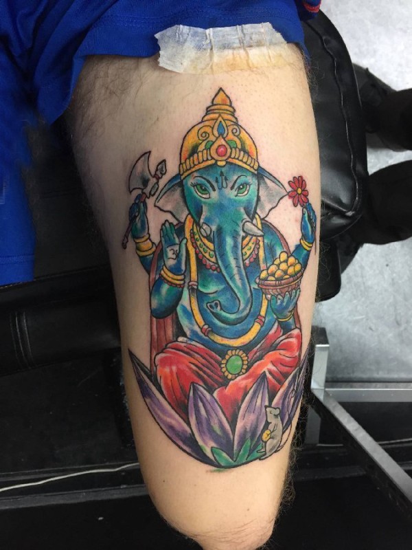 纹身大腿男 男生大腿上彩色的象神纹身图片