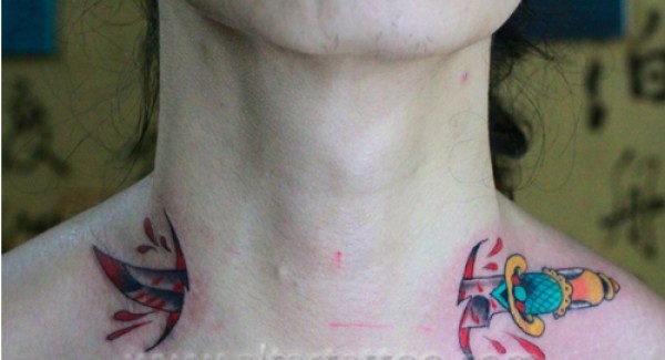 男人脖子彩色燕子刺青图案图片_脖子纹身图案大全_纹身图吧
