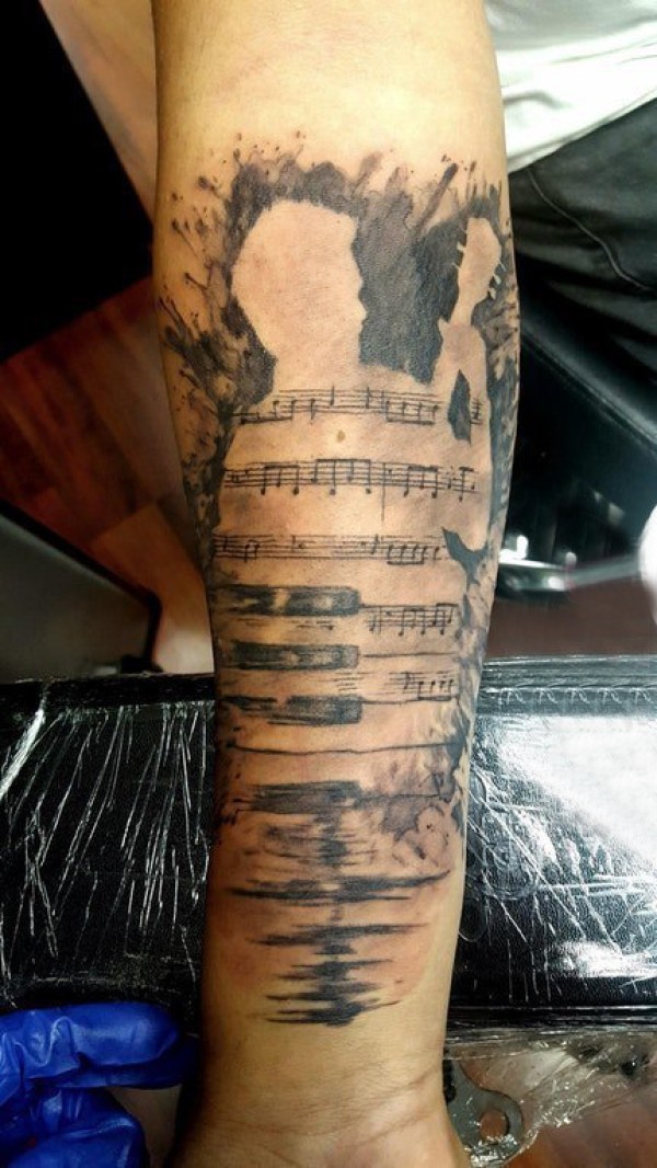 手臂纹身素材 男生手臂上音符和人物轮廓纹身图片