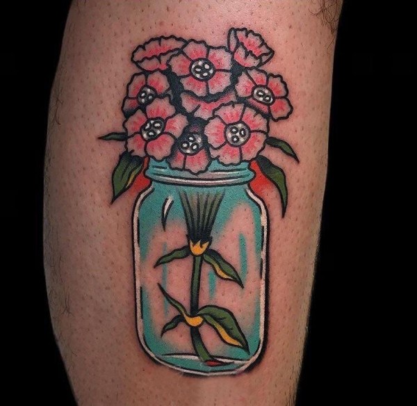 小腿对称纹身 男生小腿上花朵和瓶子纹身图片