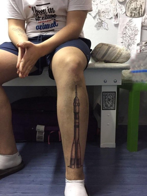 小腿对称纹身 男生小腿上黑灰的火箭纹身图片