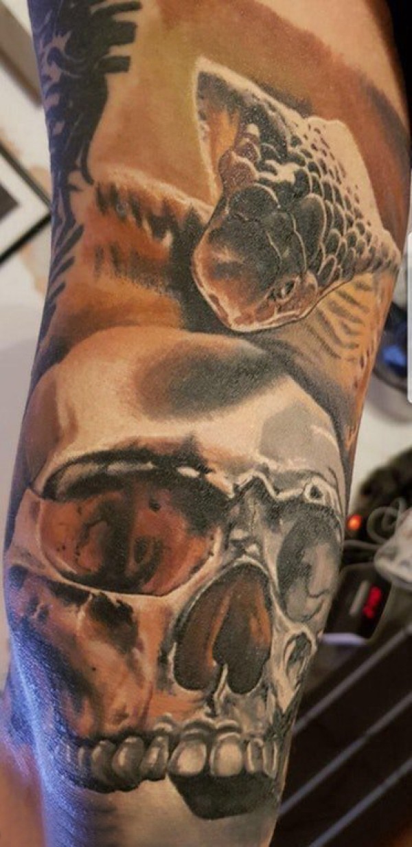 手臂纹身素材 男生手臂上蛇和骷髅纹身图片