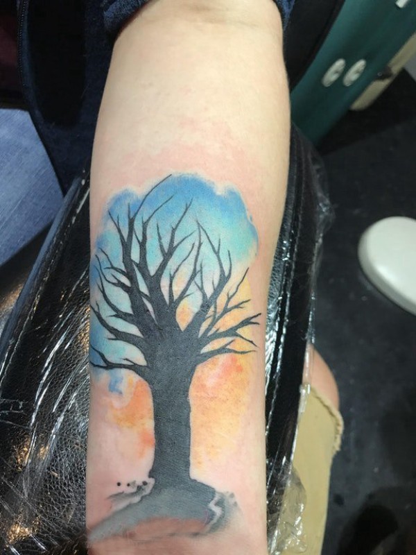 手臂纹身素材 男生手臂上彩色的生命树纹身图片