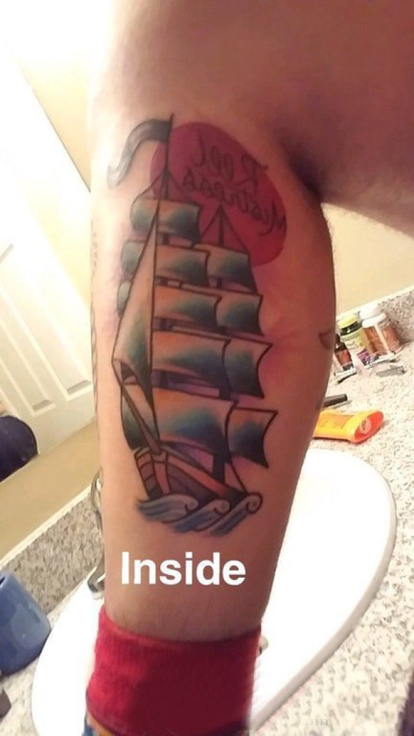 小腿对称纹身 男生小腿上彩色的帆船纹身图片