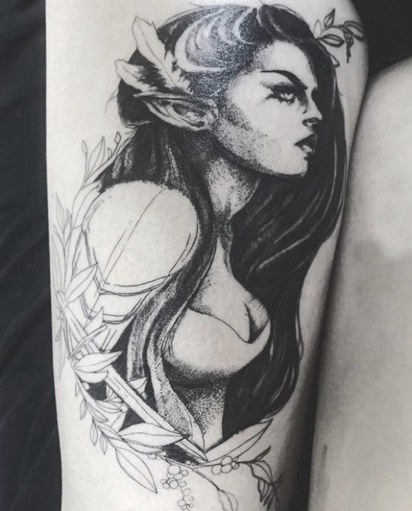 纹身腿部 女生大腿上植物和人物肖像纹身图片
