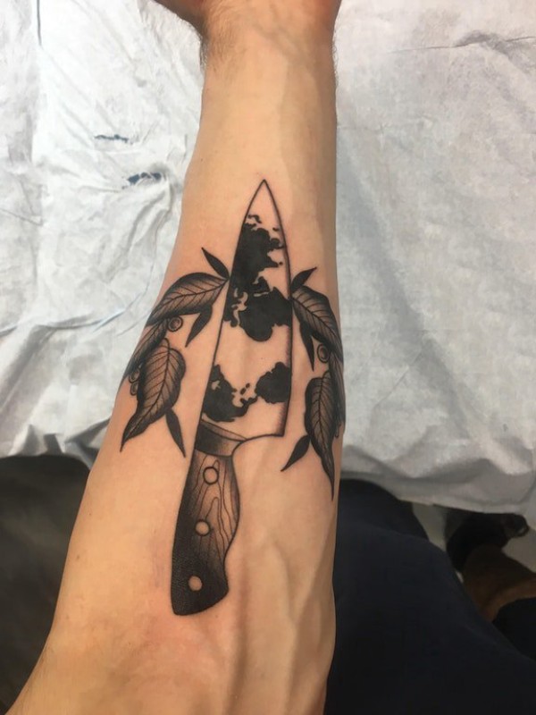 手臂纹身素材 男生手臂上植物和匕首纹身图片