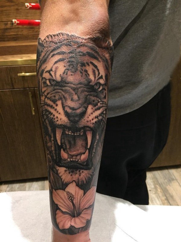 手臂纹身素材 男生手臂上花朵和老虎纹身图片