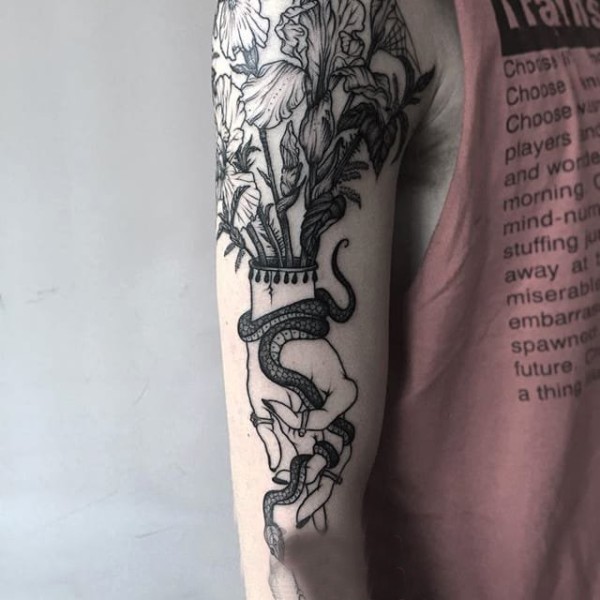 男人大臂黑白彼岸花骷髅_黑白纹身图案大全_纹身图吧