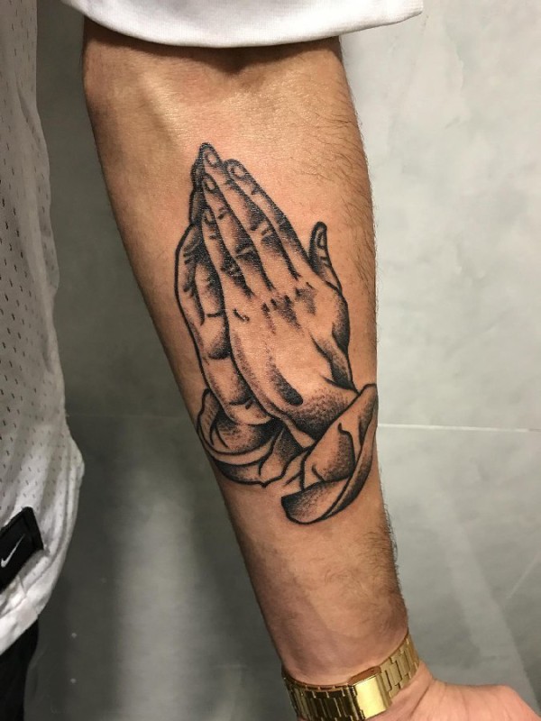祈祷之手纹身图 男生手臂上黑色的祈祷之手纹身图片