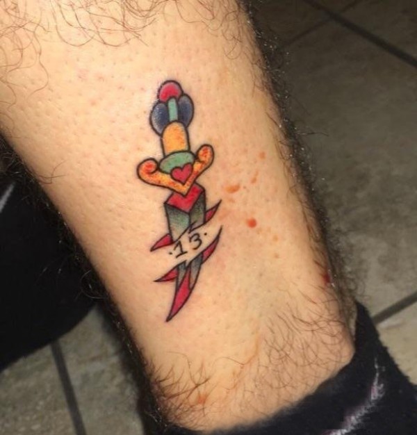 欧美小腿纹身 男生小腿上数字和匕首纹身图片