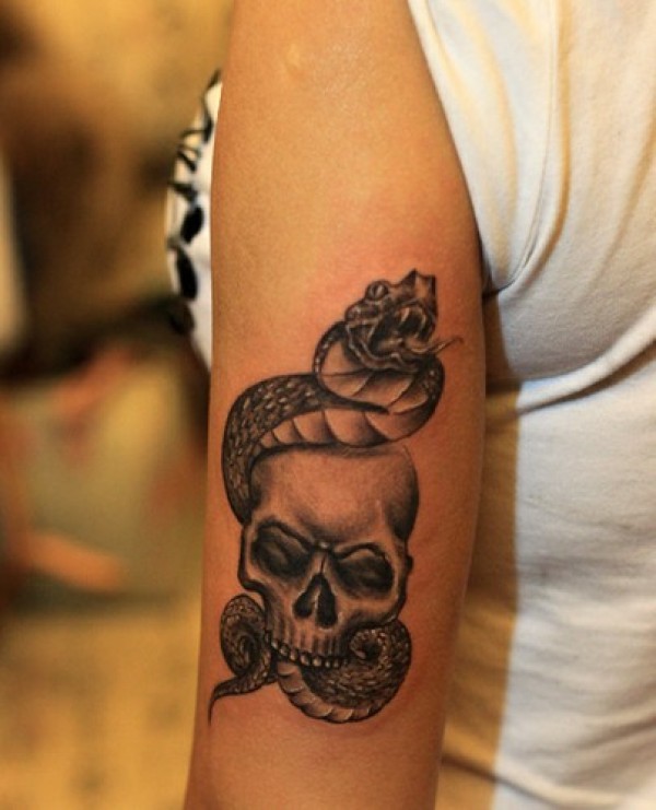 超帅时尚的黑灰骷髅与蛇纹身图案