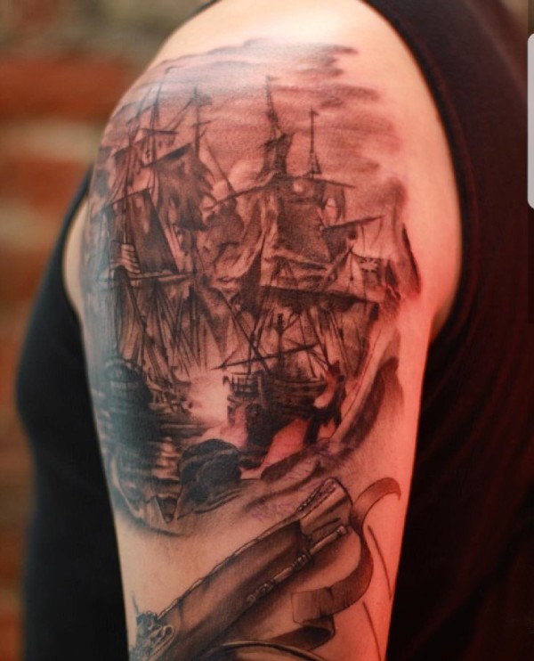 纹身小帆船 男生手臂上帆船纹身图片