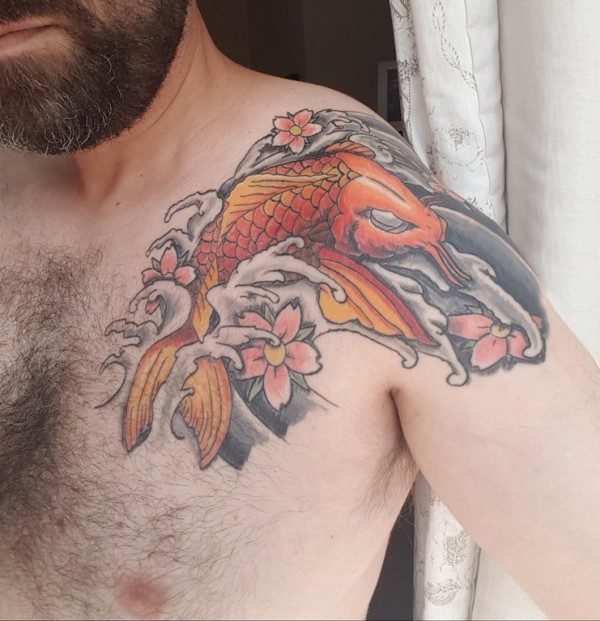 纹身红鲤鱼 男生肩部鲤鱼纹身图片