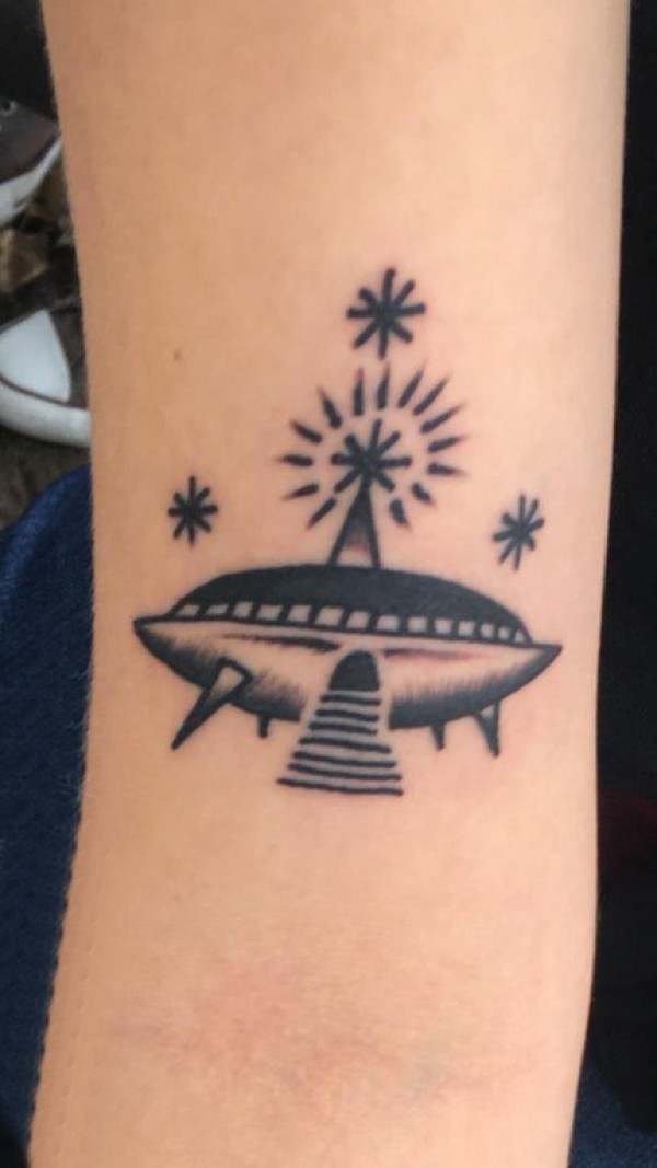手臂纹身素材 男生手臂上黑色的飞碟纹身图片