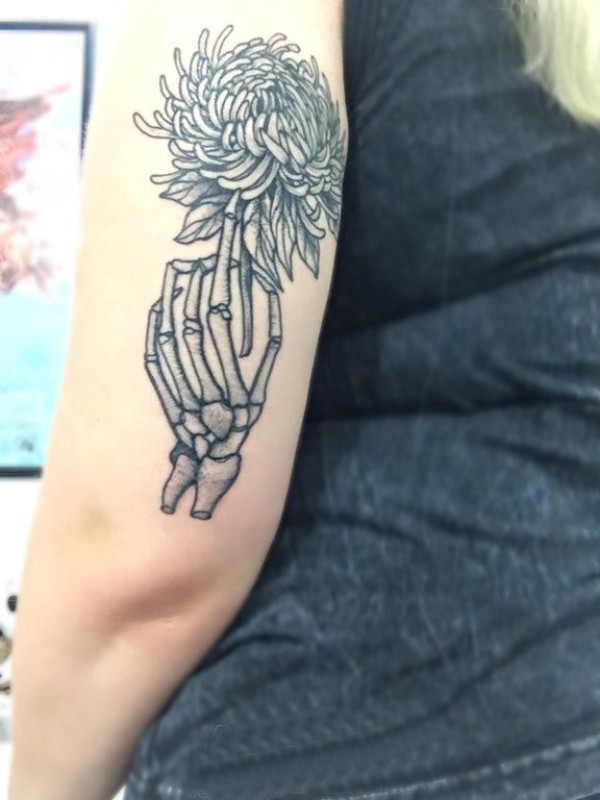 黑灰写实纹身 女生手臂上骨头和花朵纹身图片