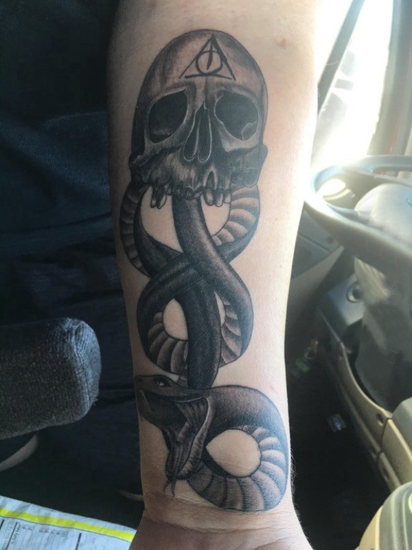 超帅时尚的黑灰骷髅与蛇纹身图案