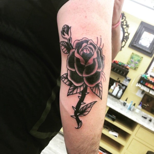 手臂纹身素材 男生手臂上黑色的玫瑰花纹身图片