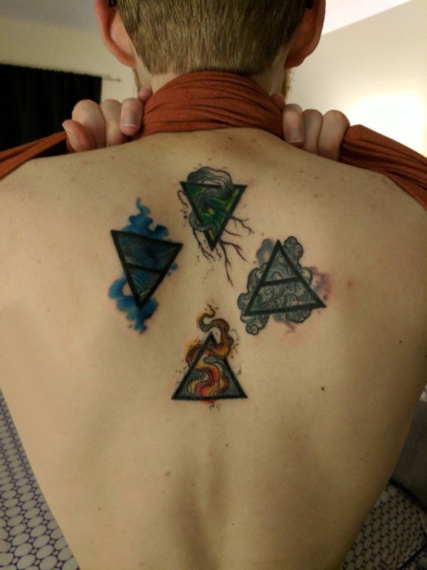 纹身后背女 女生后背上彩色的三角形纹身图片