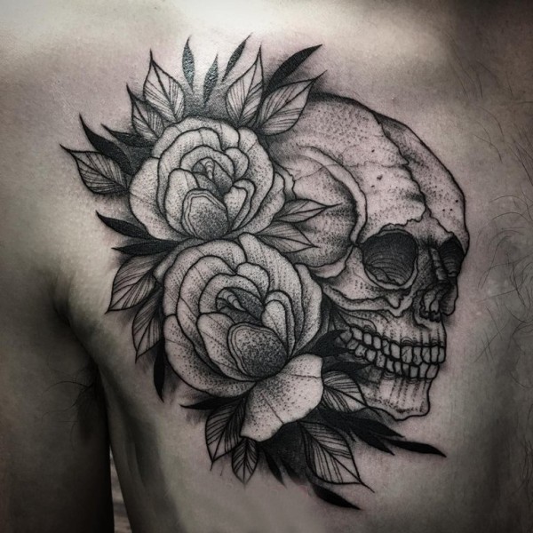 纹身胸部男 男生胸部花朵和骷髅纹身图片