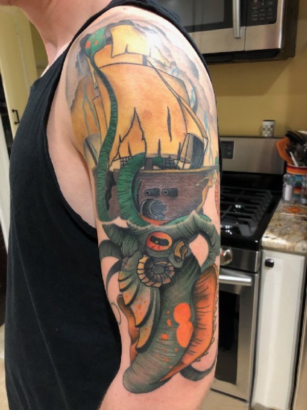 手臂纹身素材 男生手臂上帆船和章鱼纹身图片