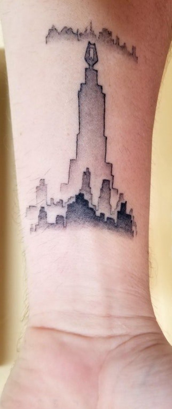 女生纹身手腕 女生手腕上黑色的建筑物纹身图片