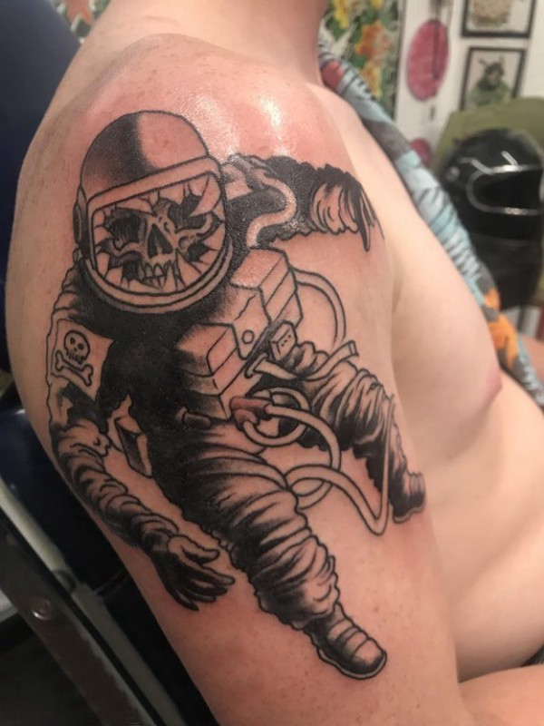 骷髅纹身 男生大臂上黑色的骷髅宇航员纹身图片