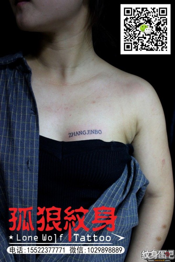 宝坻纹身 美女胸部名字纹身 宝坻孤狼纹身工作室作品 天津