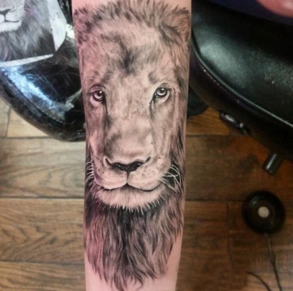 黑灰写实纹身 男生手臂上黑灰的狮子纹身图片