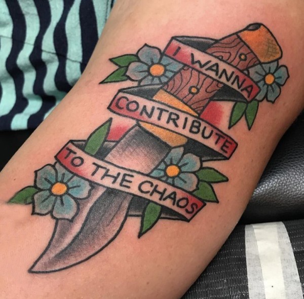 彩绘纹身 女生小腿上花朵和匕首纹身图片