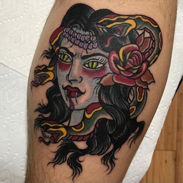 小腿对称纹身 男生小腿上玫瑰和美杜莎纹身图片