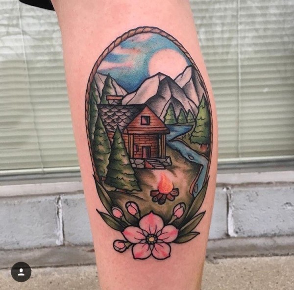 小腿对称纹身 女生小腿上花朵和风景纹身图片
