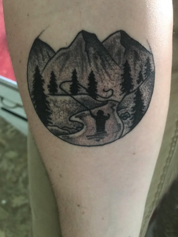纹身风景图 男生小腿上黑色的风景纹身图片