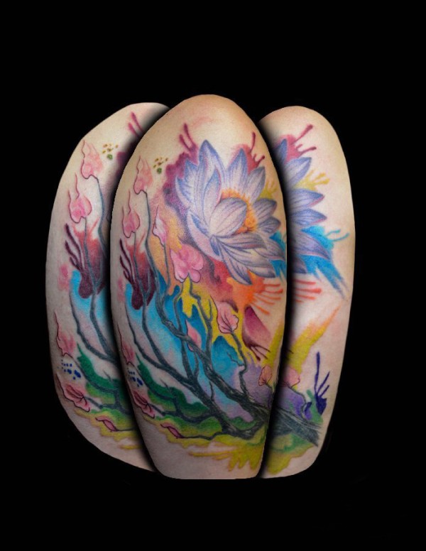 大臂纹身大全图片 男生大臂上彩色的植物纹身图片