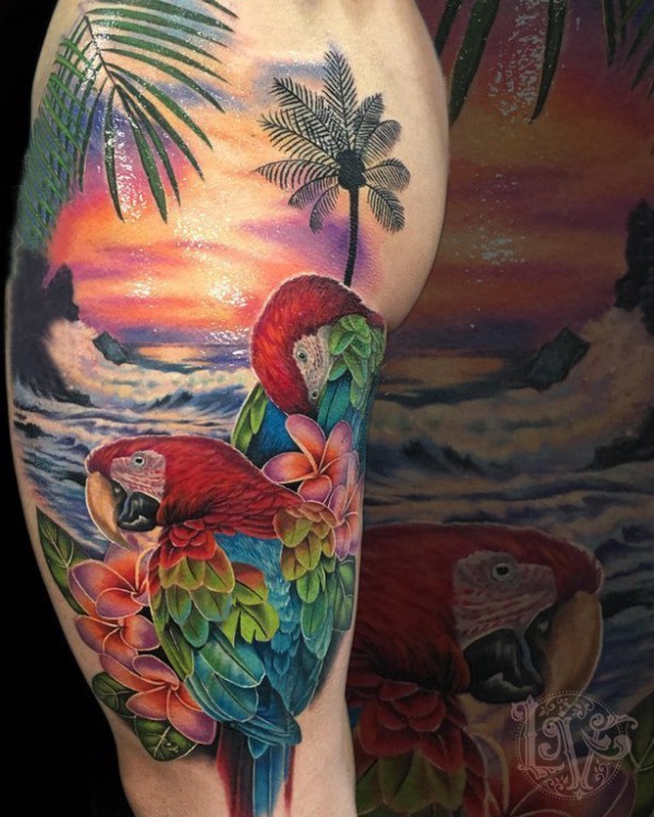 大臂纹身图 男生大臂上鹦鹉和风景纹身图片