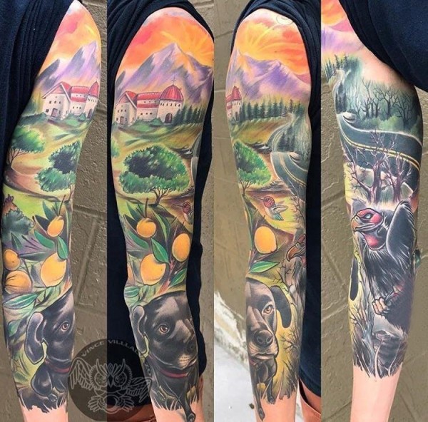 欧美花臂纹身 男生手臂上小狗和风景纹身图片