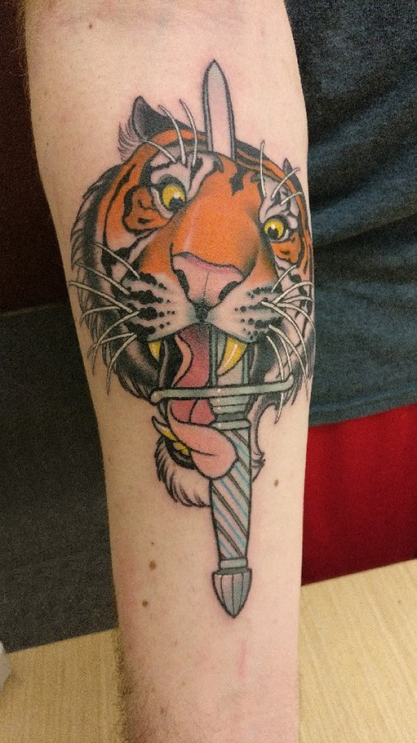 老虎图腾纹身 男生手臂上欧美匕首纹身图片