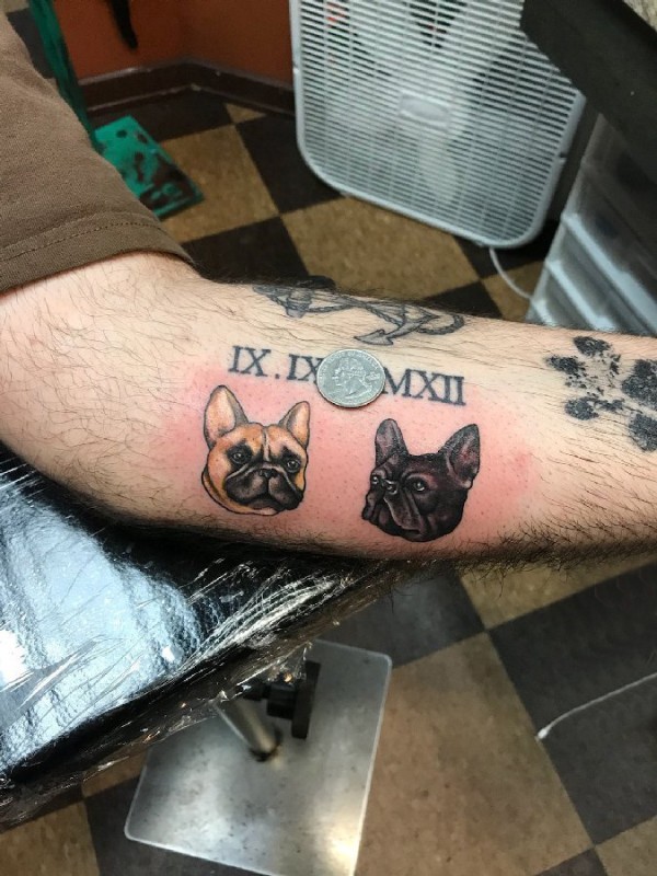 手臂纹身素材 男生手臂上彩色的小狗纹身图片