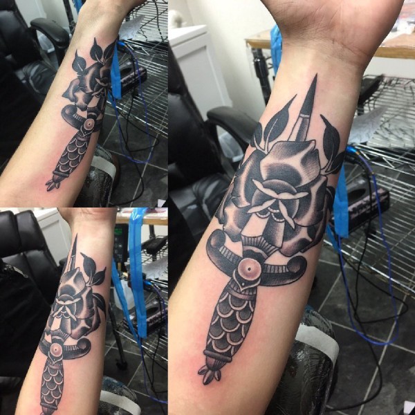 欧美匕首纹身 男生手臂上文艺花朵纹身图片