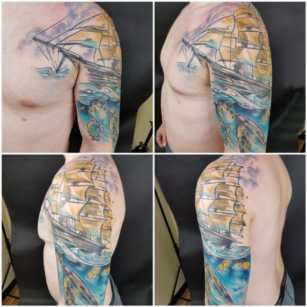 纹身小帆船 男生手臂上彩色渐变纹身帆船纹身图案