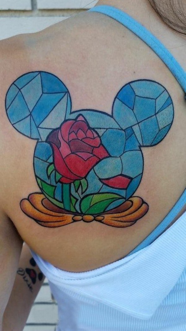 后肩纹身 女生后肩上玫瑰和米老鼠纹身图片