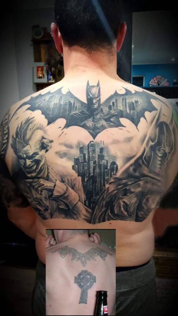 后背纹身男 男生后背上黑色的英雄人物纹身图片