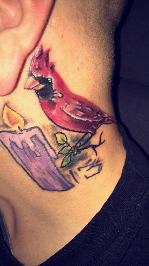 颈部纹身设计 男生颈部蜡烛和鸟纹身图片